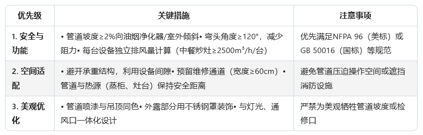 在商用厨房中,排烟管道是“生命线系统”。任何美观设计都必须在....排烟、杜绝火灾隐患、符合法规的基础上实现。 牺牲实用性追求美观可能引发..事故、罚款甚至停业,得不偿失。建议: